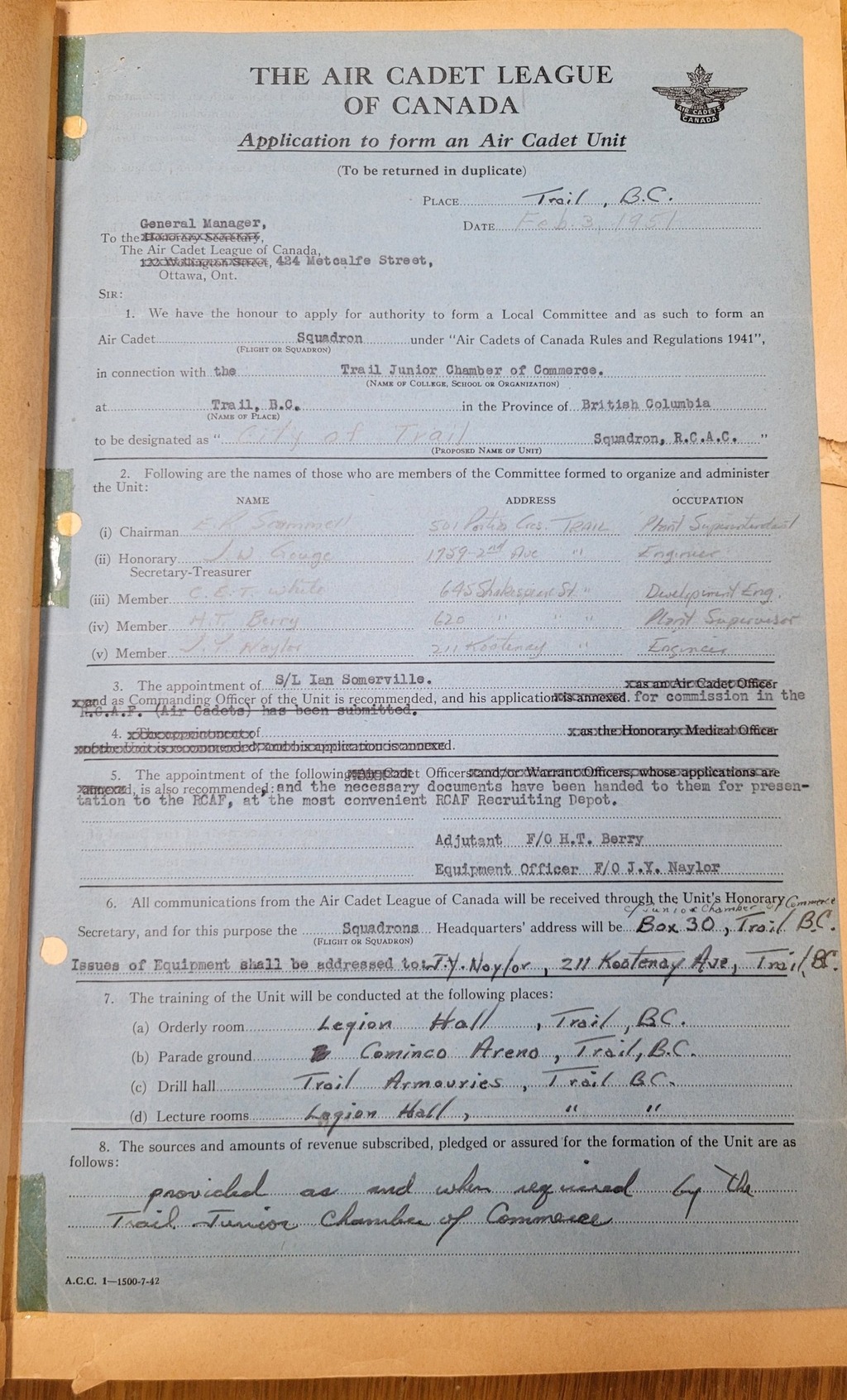 Initially, 531 paraded at the old Trail Armoury, the Arena and Legion. When the armoury closed in the early 1960's, the squadron moved to Central School in West Trail